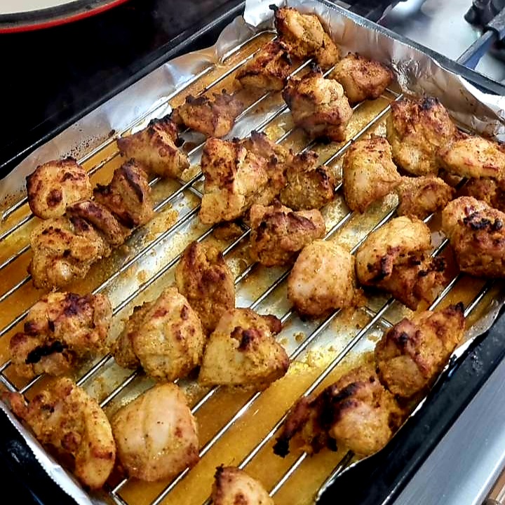 - For the chicken: Line an oven tray with foil and place the chicken on a wire rack above the foil. Turn the grill on the highest setting and grill the chicken until the edges char and take on a smokey flavour. Turn and char the other side. Depending on the size of pieces, the chicken may not be cooked in the middle, and that’s fine for now. The intention is to get smokey black bits on the outside as if the chicken has been in a tandoor. Once this is achieved, add the chicken pieces to the sauce – and importantly – tip in any juices that have collected on the foil into the sauce.