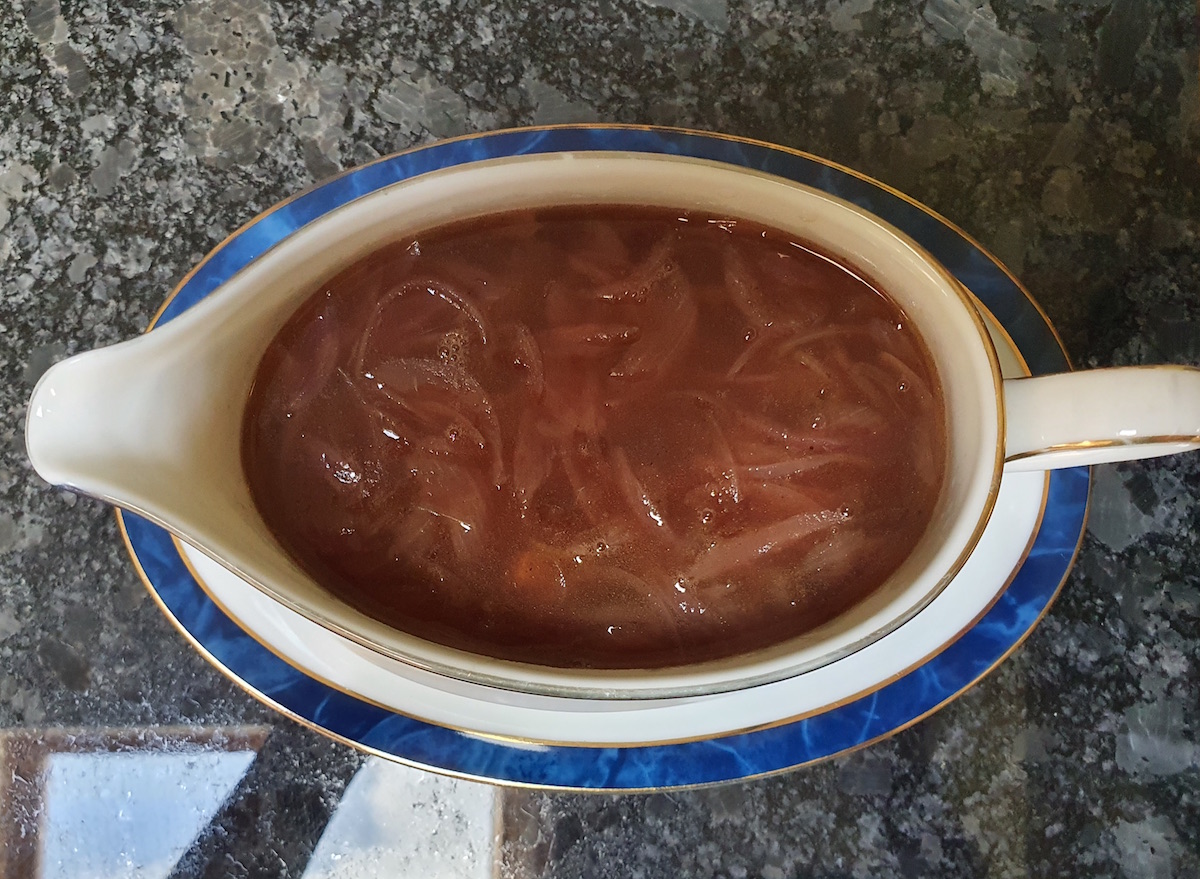 - If you have the motivation to make this very easy gravy (and it’s well worth it), then add the sliced red onions into a non-stick pan, along with a large knob of butter and the sugar to help with the caramelisation process. Gently sweat down the onions on low-medium heat. Once the onions are turning brown, add the balsamic vinegar and let this reduce ever so slightly. Quickly add the stock. Season with salt and pepper and add 1-2 good shakes of Worcestershire sauce.